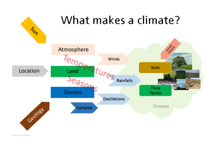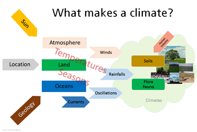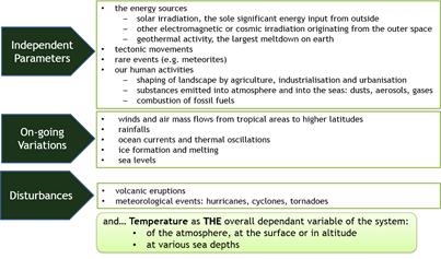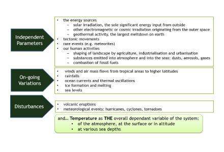 To understand how parameters interact, it is necessary to refer to established laws of physics and chemistry, or to propose new ones if there is sufficient evidence to establish them. In climate studies, the main focus is on matter and heat exchanges as well as on electromagnetic radiation.