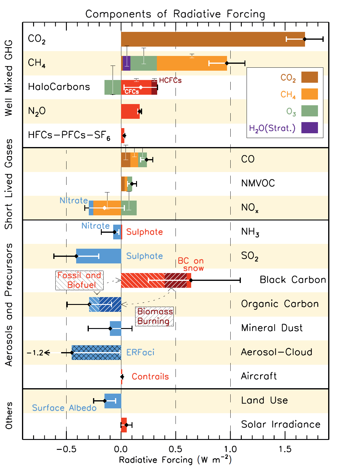 However, in IPCC’s 5th report these effects (aside of black carbon) are deemed to be of low magnitude and rather in the cooling than in the warming direction, as summarized in the nearby figure. |