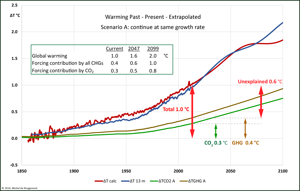 In this chart, the warming as observed and extrapolated is compared with the warming that can be attributed to the known greenhouse gases, taking into account the feedbacks discussed in the past chapter. The calculation for all 4 scenarios can be presented in a table form.
