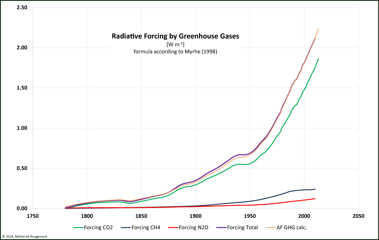 Forcings due to GHGs can be calculated from their concentrations with the formula proposed by Myrhe: