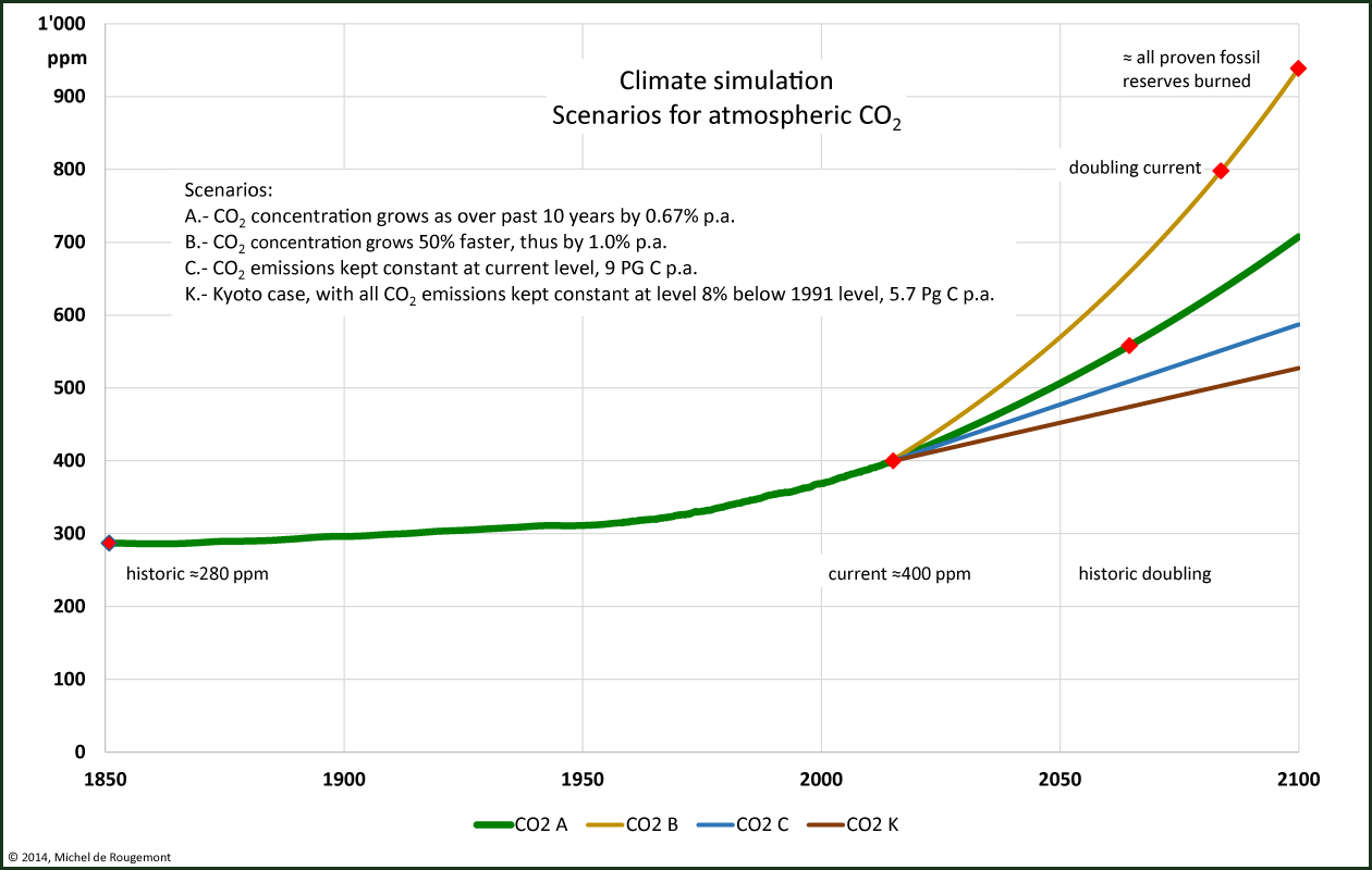 For CO2, the usual culprit, four scenarios were chosen, with CO2 as a proxy for all GHG-like forcings. All scenarios assume that methane and nitrous oxide will continue developing in parallel with the CO2 rise rate.