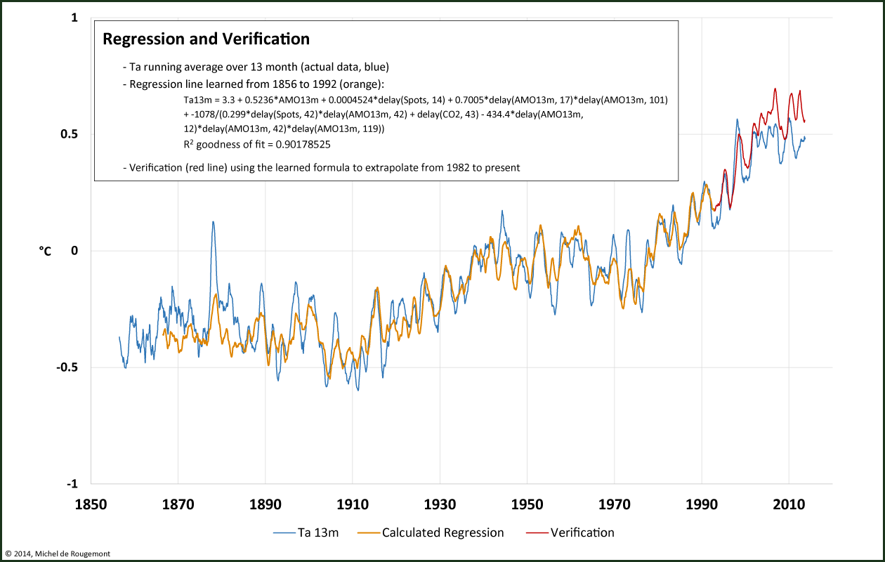 Despite of the lesser correlation fitness due to a shorter dataset, this hindsight prediction has an unprecedented quality. Even the so-called pause since the end of last century is reproduced (slightly delayed).