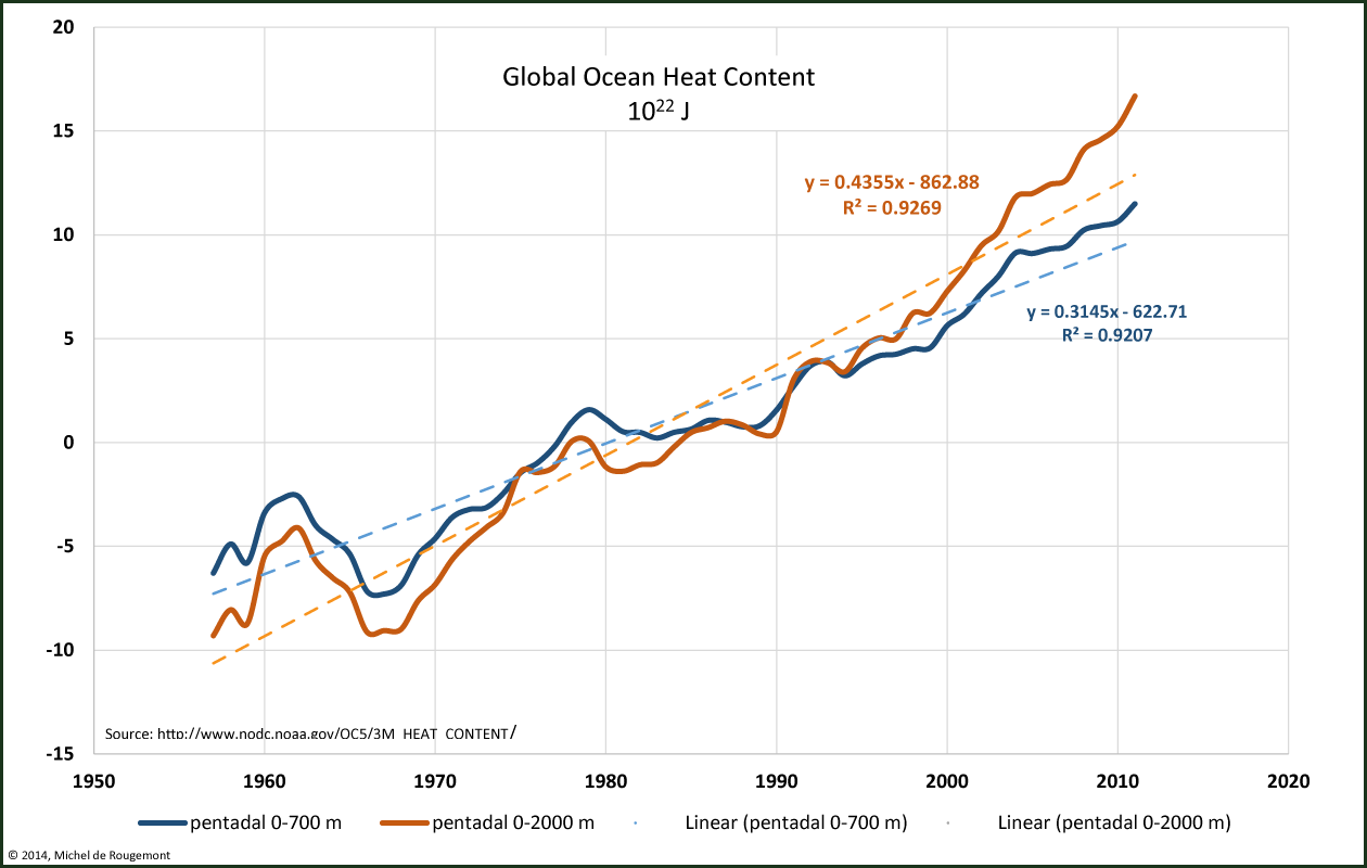 Recent measurements and evaluations have led to the short term conclusion that over the past 50 years the oceans were globally accumulating heat at the rate of 4.43 zettajoules (1021) per year, which corresponds to a net heat flux of 0.38 W m-2 over the ocean surface.