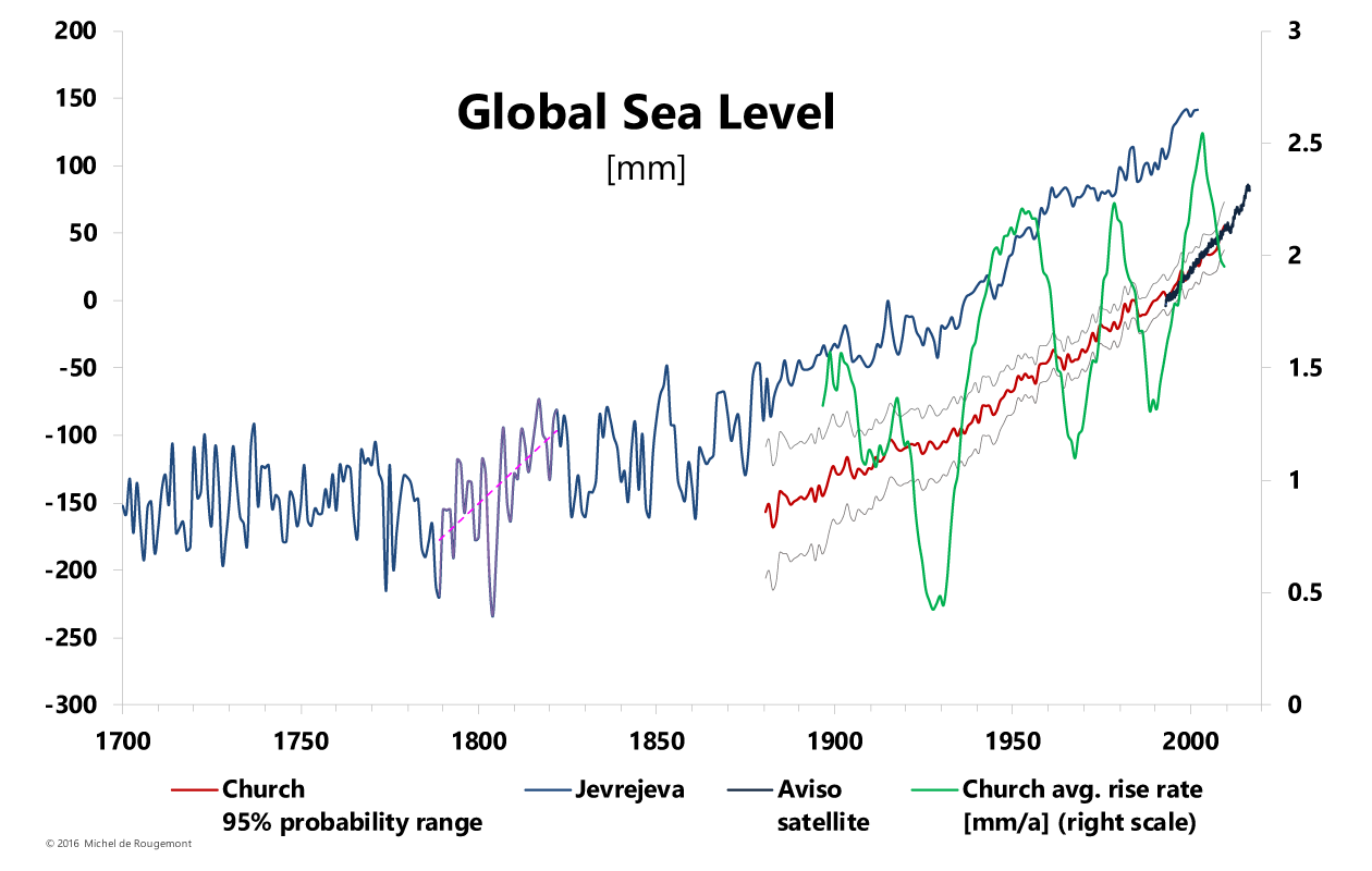 It should be noted that the sea level seems to have begun to increase at a rate of approx. 2.4 mm per year as early as at the end of the 18th century, before the industrial era, in line with the end of the Little Ice Age, with an acceleration from ~1.3 to ~1.9 mm per year over the past century.