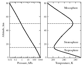 Pressure and temperature of the atmosphere vs. altitude at 30 °N latitude in March