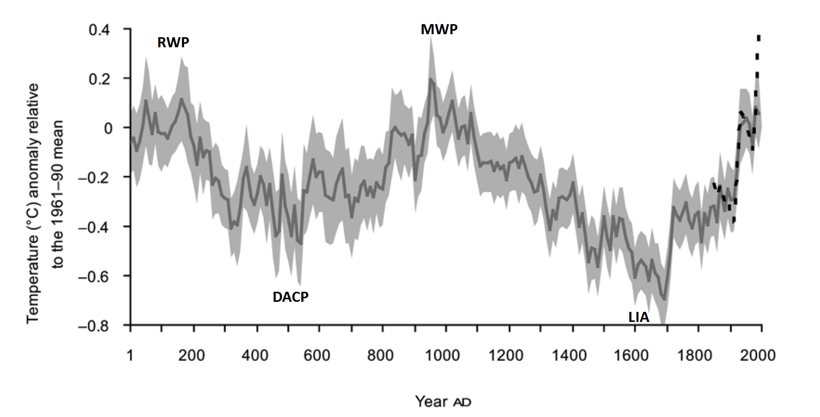 Roman and Medieval Warm Periods, Dark Age Cold Period and Little Ice Age in the extra-tropical Northern Hemisphere. Source: Ljundgquist [4]