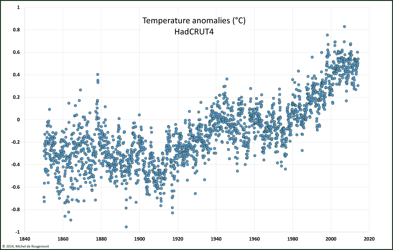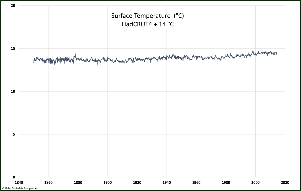 Very small differences are made visible with temperature anomalies. However, one should remember that temperature is an absolute dimension related with the energy content of the system. Seen on its full scale (here in °C, assuming a mean value of 14°C) the same graph looks much more stable: